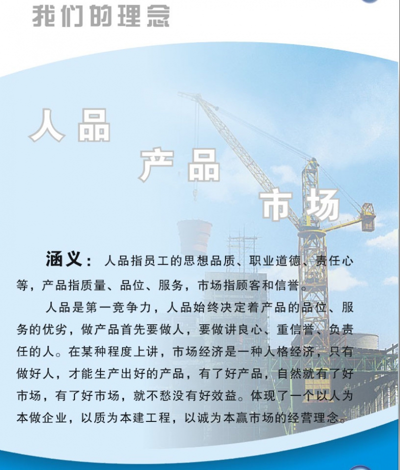 人品是第一競爭力,人品始終決定著產品的品位,服務的優劣,做產品首先要做人,要做講良心、重信譽、負責任的人,在某種程度上講,市場經濟是一種人格經濟,只有做好人,才能生產出好的產品,有了好產品,自然就有了好市場,有了好市場,就不愁沒有好效益。體現了一個以人為本做企業,以質為本建工程,以誠為本贏市場的經營理念。