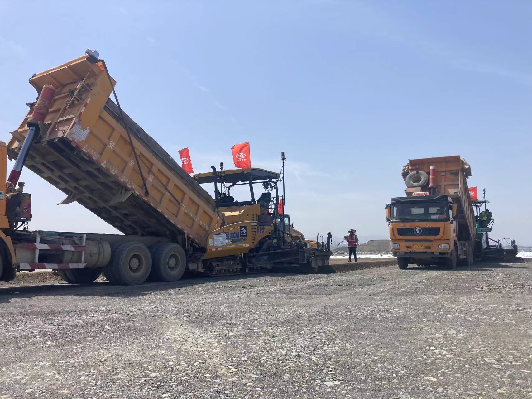 為保證攤鋪?lái)樌M(jìn)行,項(xiàng)目部前期做好各項(xiàng)準(zhǔn)備工作,在施工過(guò)程中,嚴(yán)格把控施工環(huán)節(jié),確保攤鋪施工銜接有序,高效優(yōu)質(zhì),一次成型,并使用mmGPS 3D攤鋪技術(shù)進(jìn)行兩機(jī)聯(lián)鋪。
